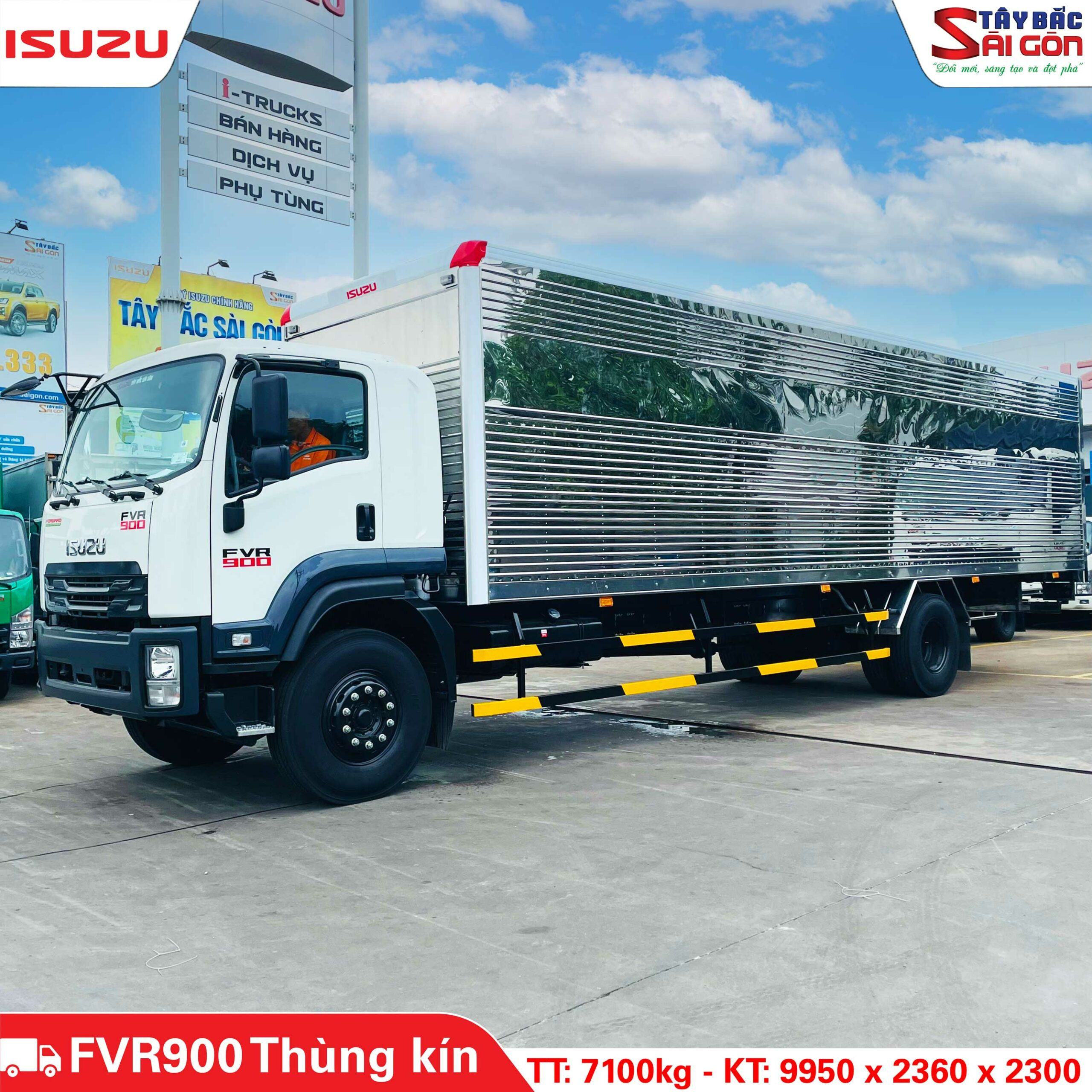 Xe Isuzu FVR900 thùng kín là phiên bản cải tiến của dòng FVR với phần thùng được đóng kín hoàn toàn bằng tôn kẽm hoặc inox, khung xương chắc chắn, cửa sau bản lề mở rộng, sàn dập sóng chống trượt.